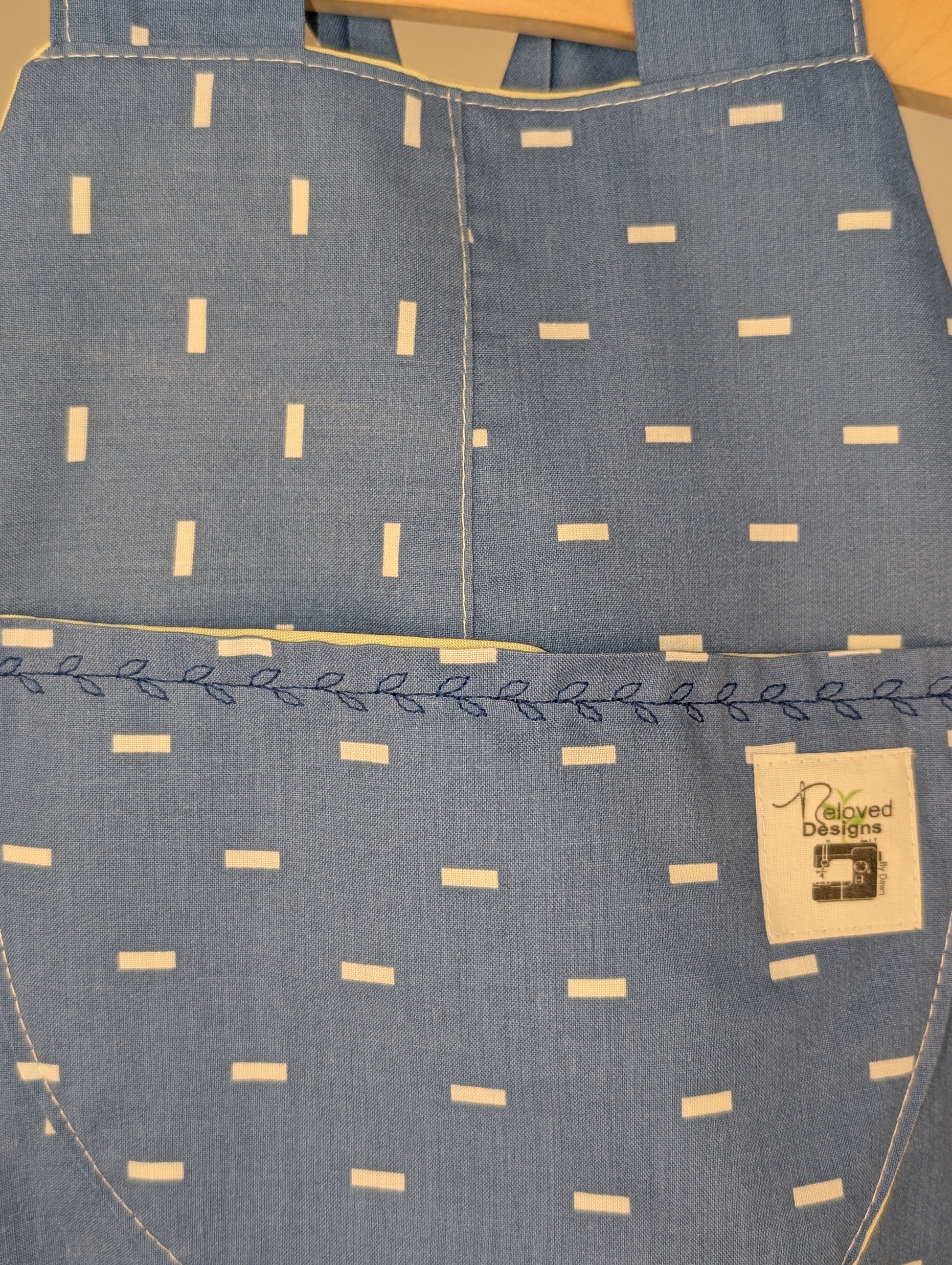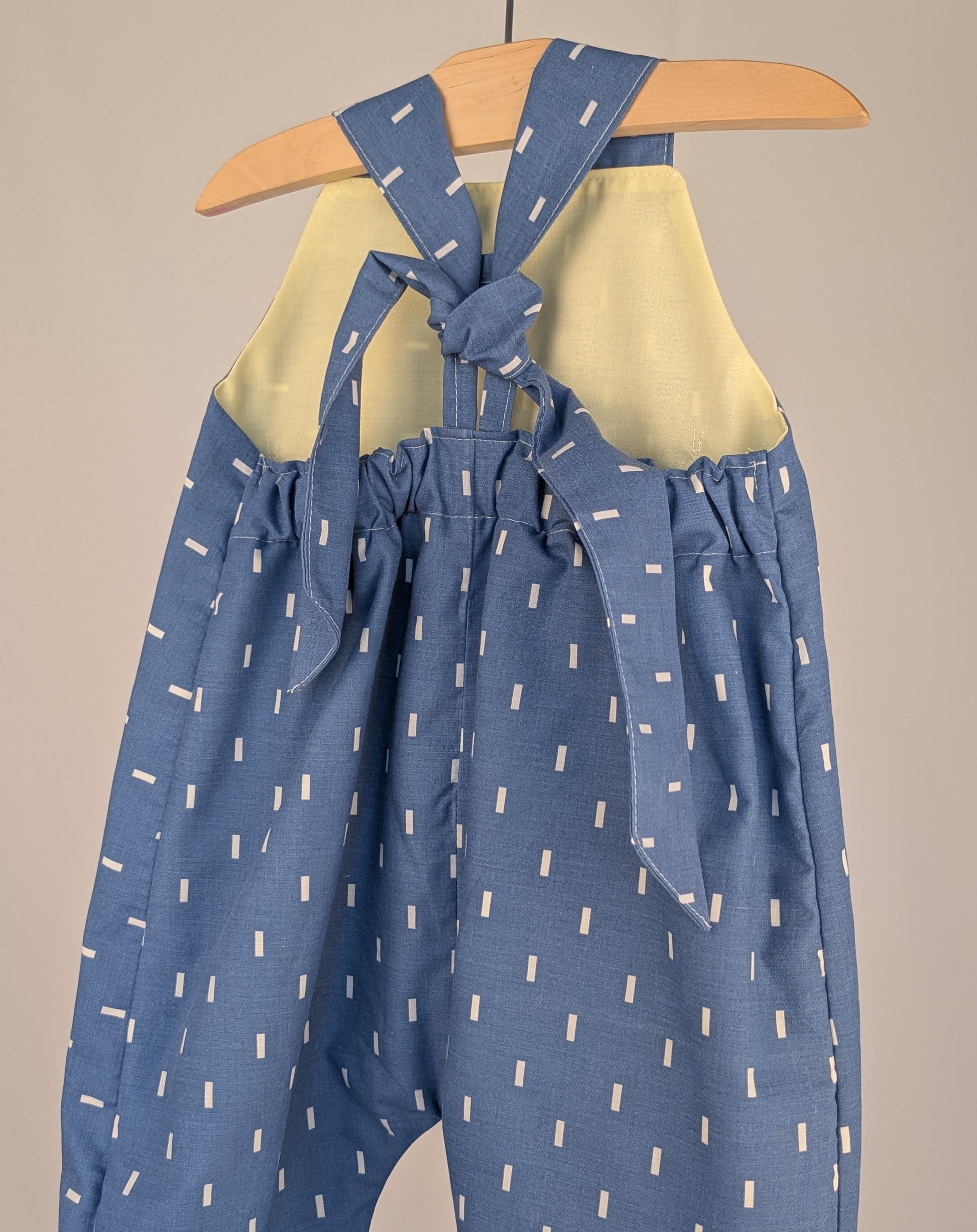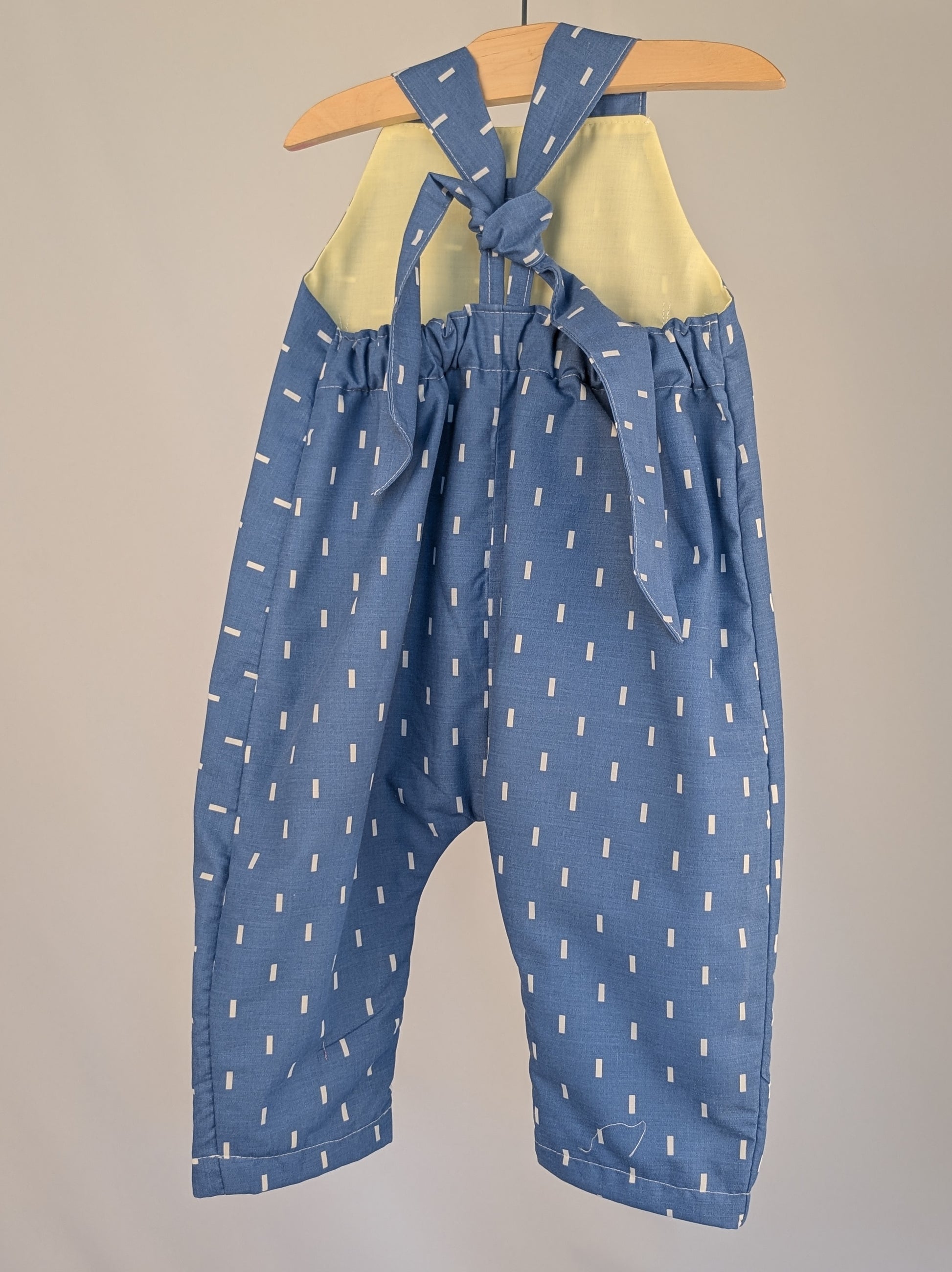 cute little kids blue dungarees that tie at the back with adjustable straps.