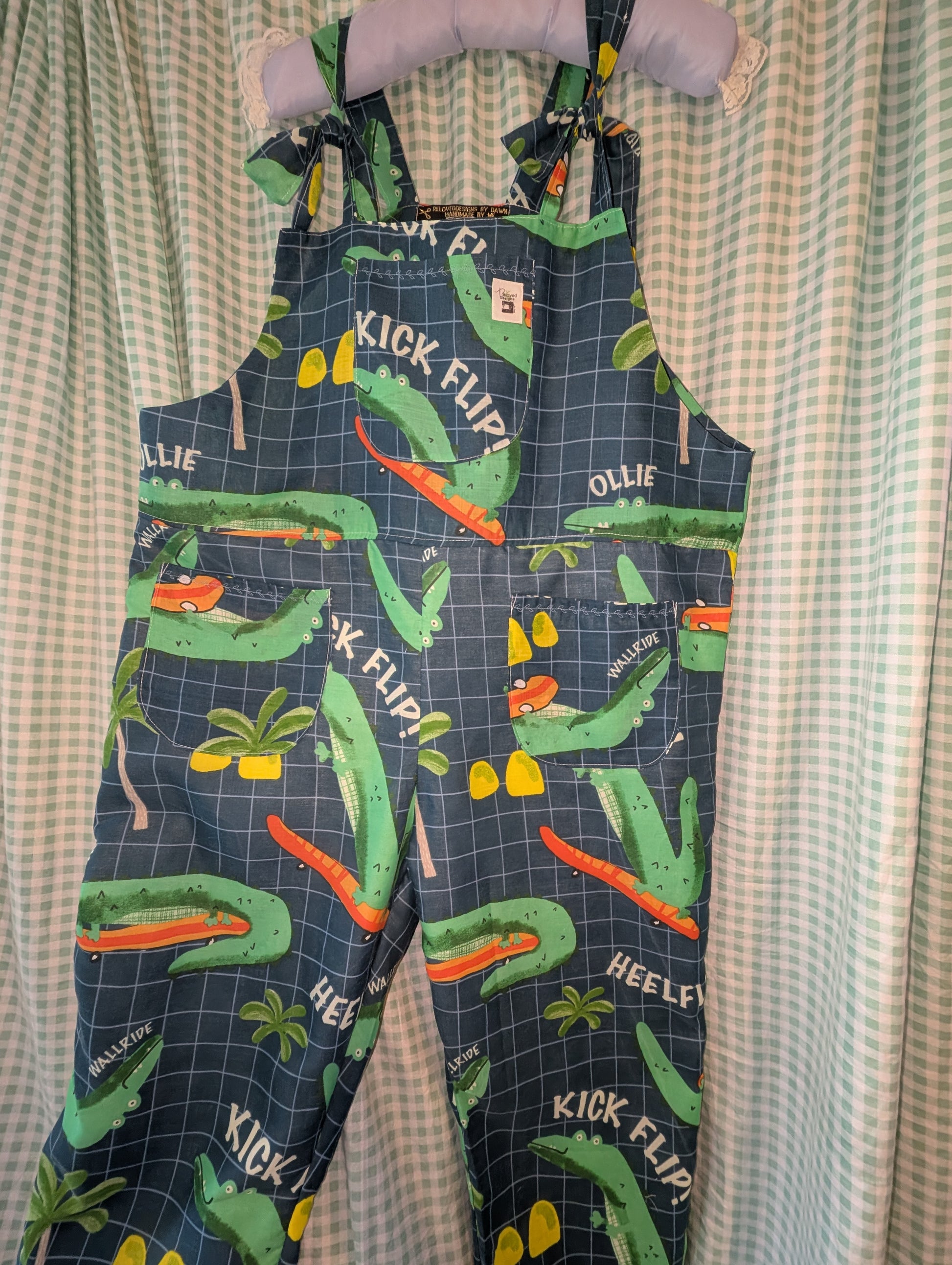 Handmade in my home studio using reworked Upcycled textiles Size 16-18/XL dungarees checked blue with fun green crocodile print, cotton mix textiles.